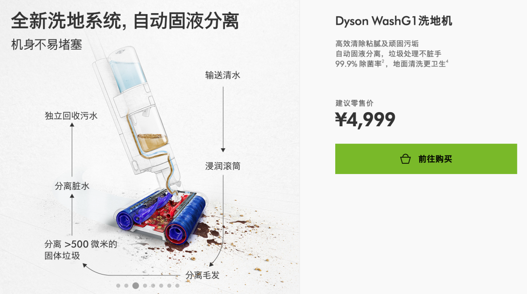 有意思的是,戴森在2024年发布的WashG1手握式洗地机,其核心清洁逻辑就曾被质疑是直接采用的杉川自有品牌3i的净地站解决方案,即采用机械滚筒+水循环模式来替代传统的吸尘技术。