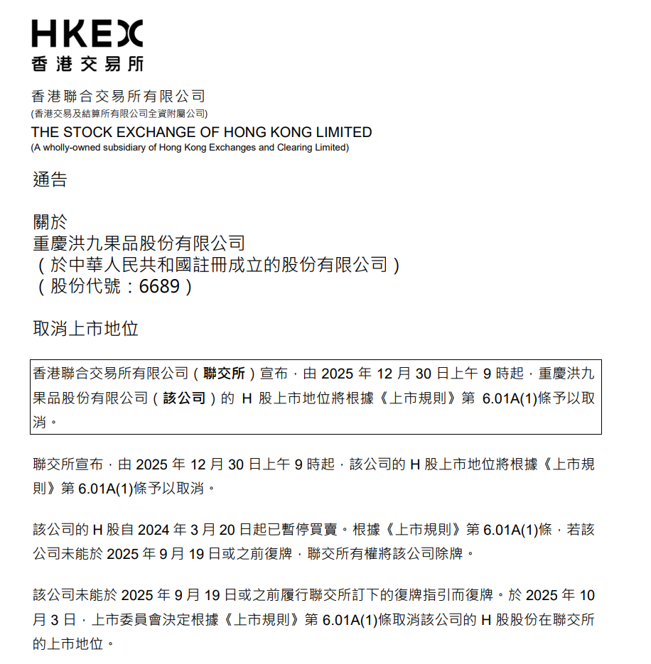 12月24日,香港联合交易所发布公告,宣布自12月30日上午9时起,取消洪九果品的H股上市地位。