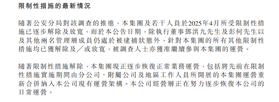 5月20日,洪九果品披露了公司相关人员被采取限制性措施的最新情况。截至该公告日,除了邓洪九、彭何以及其他两名管理层成员仍处于被逮捕状态外,公安机关针对公司人员的其他限制性措施均已获解除、放宽,被调查人士获准继续参与公司运营。