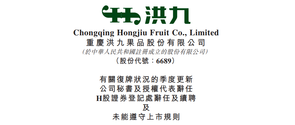因无法按时披露财报,停牌超过一年半的“水果第一股”洪九果品(06689.HK)迎来退市终局。