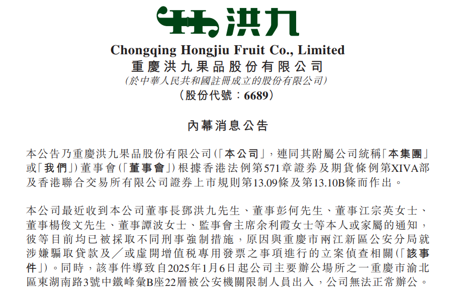 2025年4月16日,洪九果品公告,公司董事长邓洪九、董事彭何、董事江宗英、董事杨俊文、董事谭波、监事会主席余利霞等人,因涉嫌骗取贷款及虚开增值税专用发票,被公安机关采取刑事强制措施。同时,该事件导致自2025年1月6日起,洪九果品主要办公场所之一重庆市渝北区东湖南路3号中铁峰汇B座22层被公安机关限制人员出入,公司无法正常办公。
