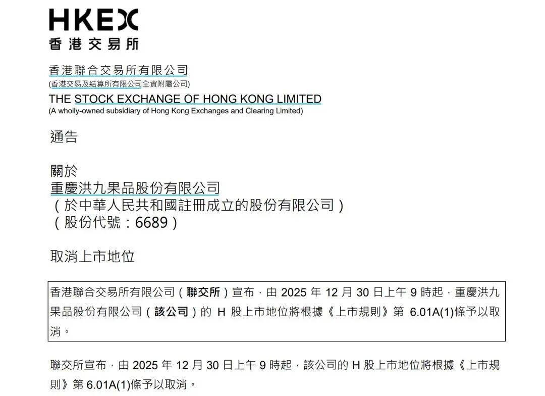 近日,香港交易所发布通告称,2025年12月30日上午9时起,洪九果品的H股上市地位将予以取消。通告显示,洪九果品的H股自2024年3月20日起已暂停买卖,且未能在9月19日或之前复牌,2025年10月3日,香港联交所上市委员会决定取消洪九果品的上市地位,公司曾于10月13日申请复核,但是上市复核委员会维持取消公司上市地位的决定。
