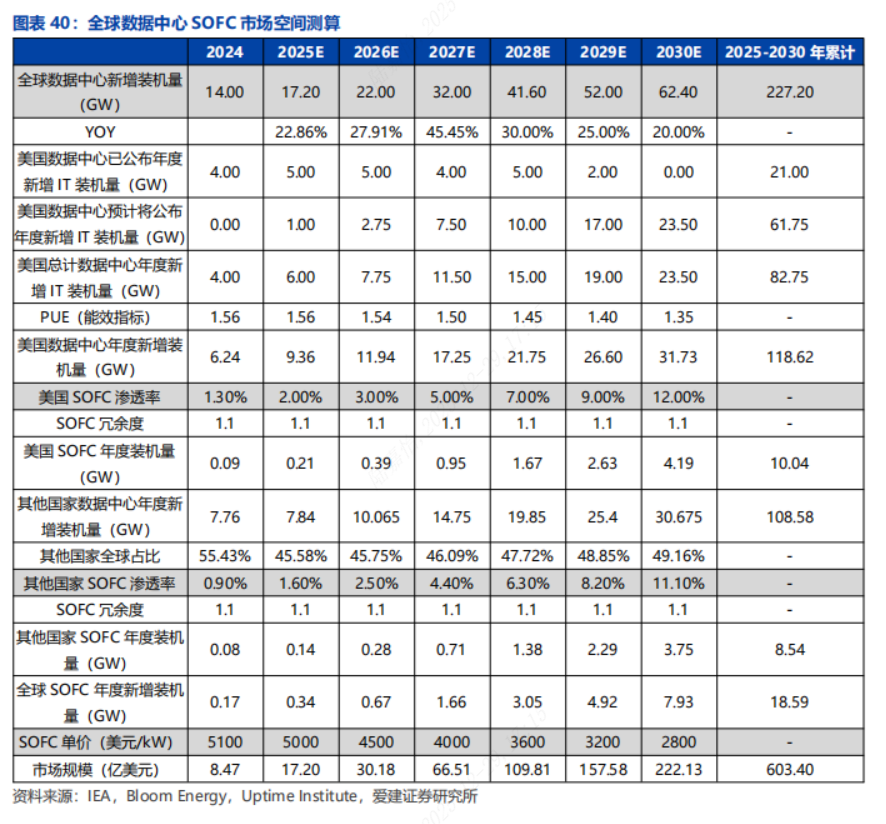 全球数据中心建设持续保持高增长,我们假设2025-2030年全球数据中心年度新增装机量为17.20/22.00/32.0/41.60/52.00/62.40GW,美国SOFC渗透率为2%/3%/5%/7%/9%/12%,其他国家SOFC渗透率为1.6%/2.5%/4.4%/6.3%/8.2%/11.1%,SOFC单价分别为5000/4500/4000/3600/3200/2800美元/kW,我们预计2025-2030年全球SOFC市场规模累计可超600亿美元。
