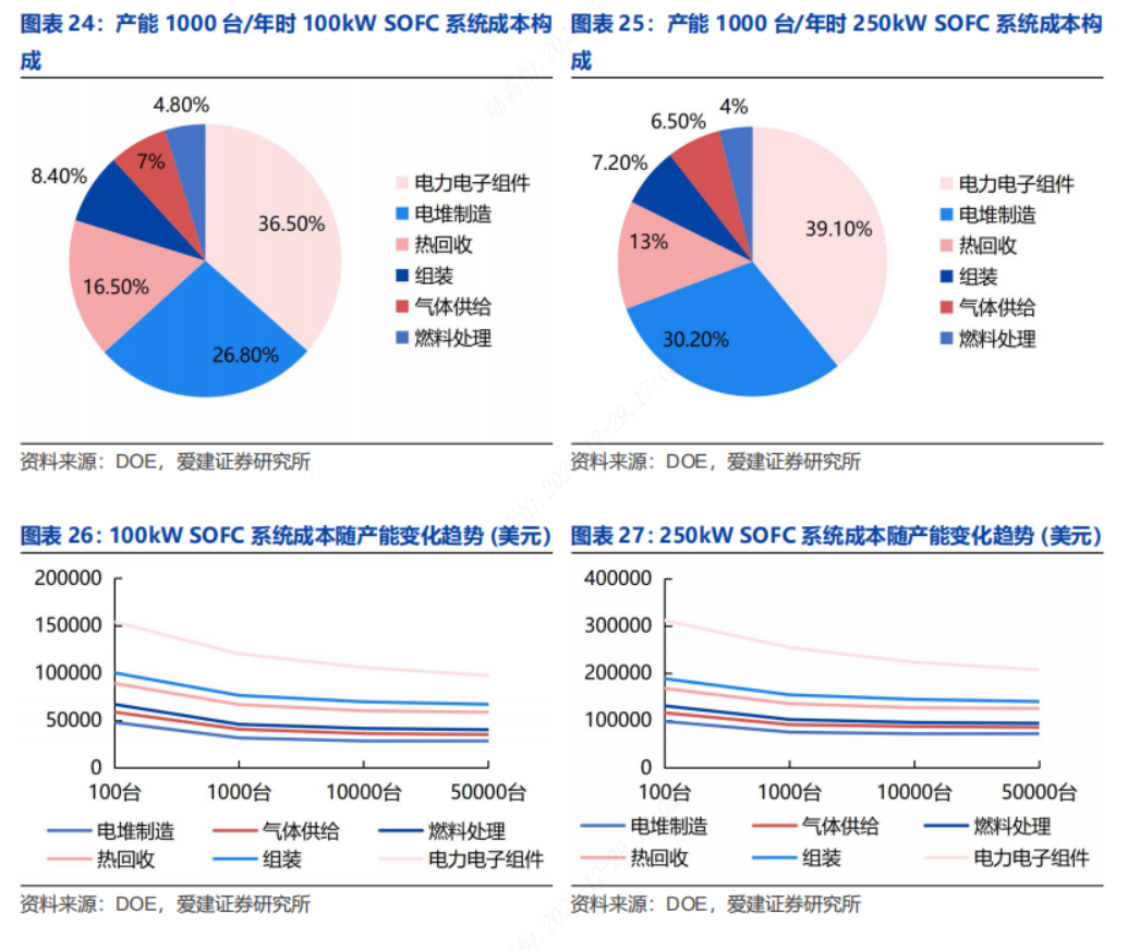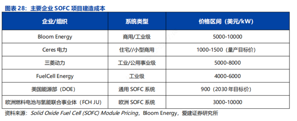 ◼有别于大众的认识:市场普遍认为SOFC建设成本和LCOE较高,规模化商用前景不明朗。我们认为美国缺电问题逐步凸显,现场发电方式将受到重点关注,SOFC部署周期短,可快速响应负载功率波动,适配数据中心需求,会促使SOFC技术的快速落地和规模化部署,随着量产规模的逐渐提升,SOFC的建设成本和LCOE会逐渐降低。
