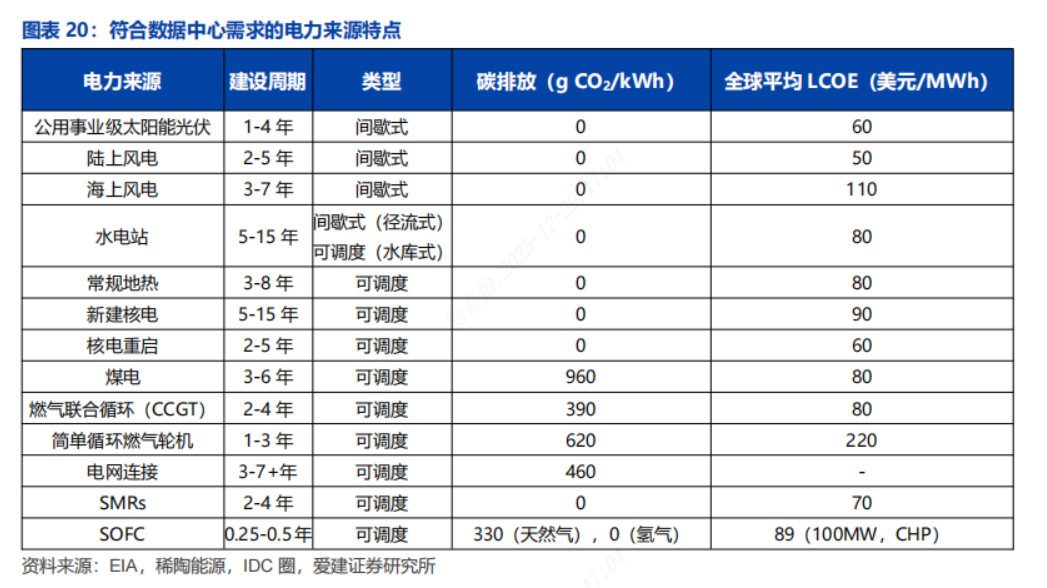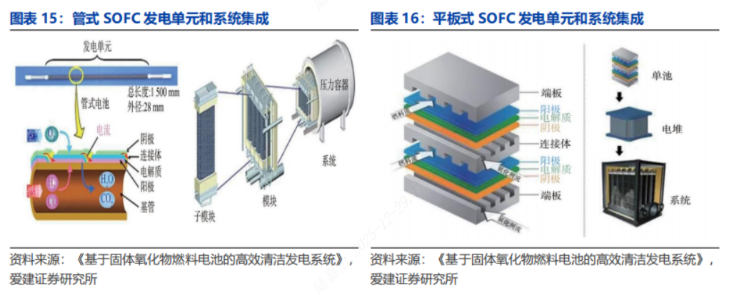 ◼破局:固体氧化物燃料电池(SOFC)部署快+响应负载快+经济性,适配数据中心供电。1)现场发电:现场发电是指在数据中心所在地直接发电,部分或全部替代对传统电网的依赖。核电、水电以及煤电等供电方式的部署周期较长,和数据中心建设周期匹配性较差。现场发电是有效的满足数据中心供电需求的电力供应方式,2030年前落地的数据中心现场发电项目主要涉及燃气轮机、燃料电池及往复式发动机三类技术,另有部分数据中心开始采用地热发电、小型模块化反应堆(SMRs)等新兴技术。2)SOFC:原理上SOFC是采用固态电解质的一类燃料电池,通过电化学反应产出电能和热能;结构上SOFC由电池单元堆叠形成电堆,电堆和外围辅助单元共同构成SOFC系统;形式上根据单元组件设计的不同,SOFC主要分为管式和平板式两种结构。3)SOFC可模块化快速安装,能够快速响应负载功率波动,LCOE低于简单循环燃气轮机等发电方式,并有望随量产规模扩大持续降低。
