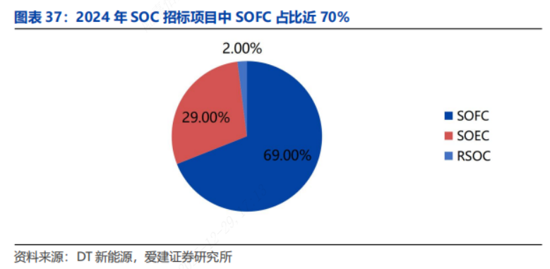 ◼格局:数据中心是重要应用场景,日英美企业市场占有率高,国内厂商积极布局。1)数据中心是SOFC主要应用场景之一,SOFC市场日本、英国和美国企业市场份额高。SOFC应用场景中数据中心占比在40%以上,数据中心建设的持续推进提供了SOFC应用的广阔空间。全球SOFC市场格局方面日本、英国和美国企业占据主要地位,其中日本企业三菱动力和爱信精机市场占有率分别为14.80%和10.44%,英国企业Ceres电力市场占比为12.40%,美国企业Bloom Energy市场占比约为9.40%。2)国内逐渐布局SOFC技术应用。SOFC、固体氧化物电解池(SOEC)和可逆固体氧化物电池(RSOC)统称为SOC,2024年国内SOC招标项目数为48个,主体设备的额定功率总计达近800kW,上述项目中SOFC占比近70%。从中标项目数量来看,氢邦科技以14项中标项目领先,质子动力以7个项目位于第二,三环集团以3个项目数位居第三;从公布的项目主体设备装机功率来看,三环集团以超过330kW的总功率领先,总装机功率超过百千瓦的企业还包括中国华能、潍柴动力等企业,氢邦科技、质子动力以较高的配套量位于前列。