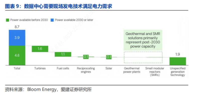 现场发电:现场发电是指在数据中心所在地直接发电,部分或全部替代对传统电网的依赖。核电、水电以及煤电等供电方式的部署周期较长,和数据中心建设周期匹配性较差(2024年中国数据中心平均交付周期约为1年)。现场发电是有效的满足数据中心供电需求的电力供应方式,2030年前落地的数据中心现场发电项目主要涉及燃气轮机、燃料电池及往复式发动机三类技术,另有部分数据中心开始采用地热发电、小型模块化反应堆(SMRs)等新兴技术,这类新兴技术预计要到2030年后才会实现大规模商用。现场发电正逐渐从传统的备用电源角色,转变为主要的或重要的补充性能源。