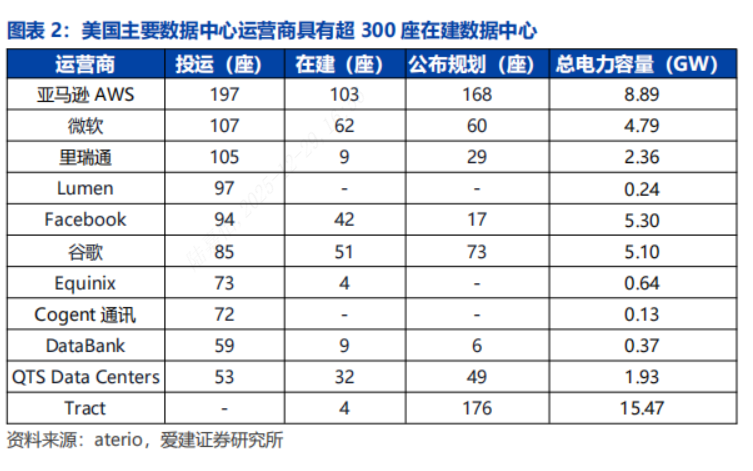 增量:2025-2030年美国预计新增数据中心IT容量达55GW。美国数据中心主要运营商拥有超过300座在建数据中心,亚马逊AWS、Tract等厂商已公布的规划中数据中心均超160座,预计未来五年美国新增数据中心IT容量可达55GW。