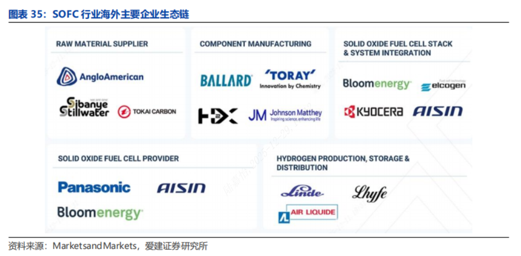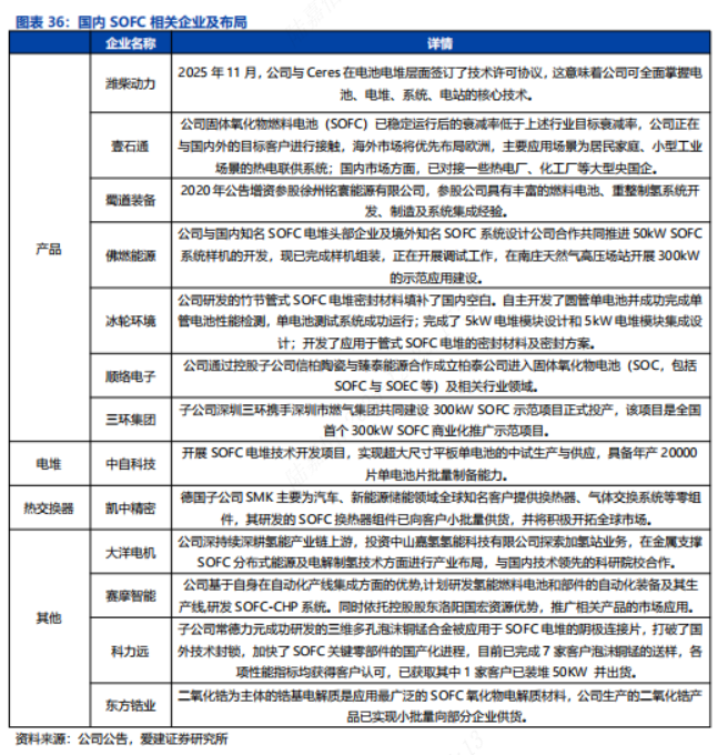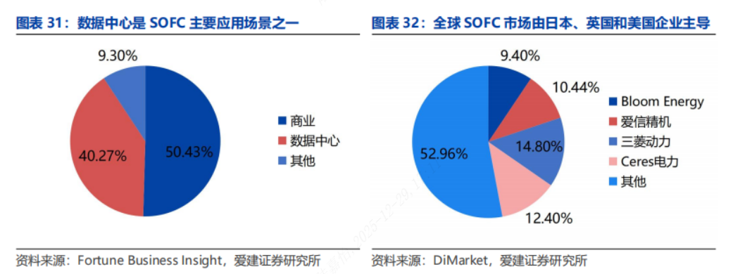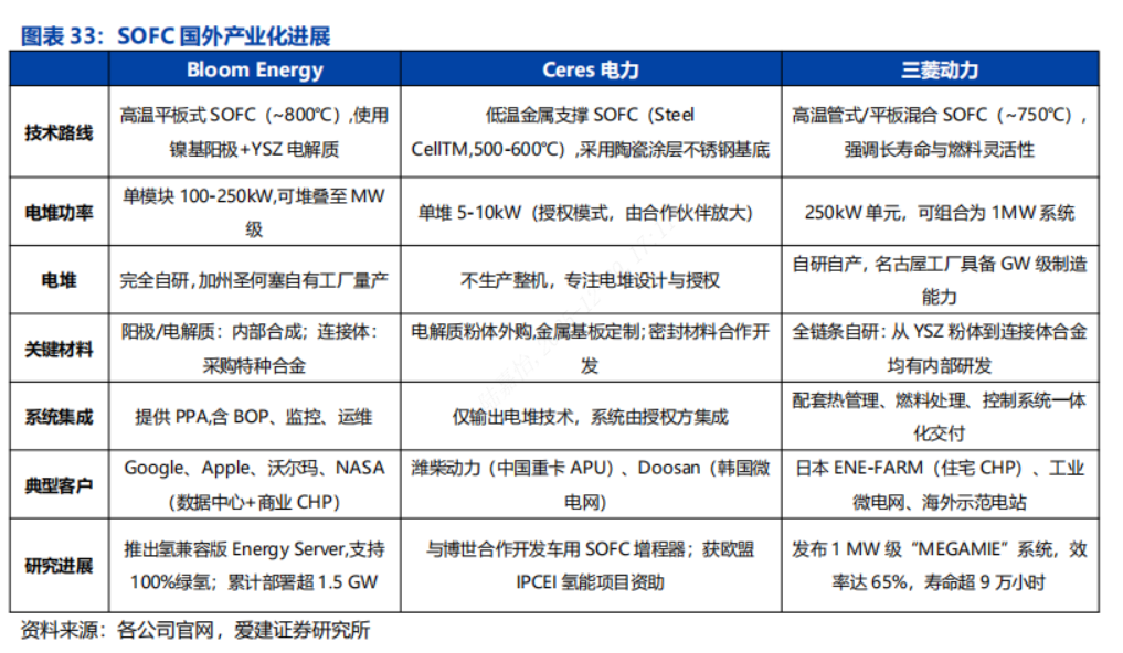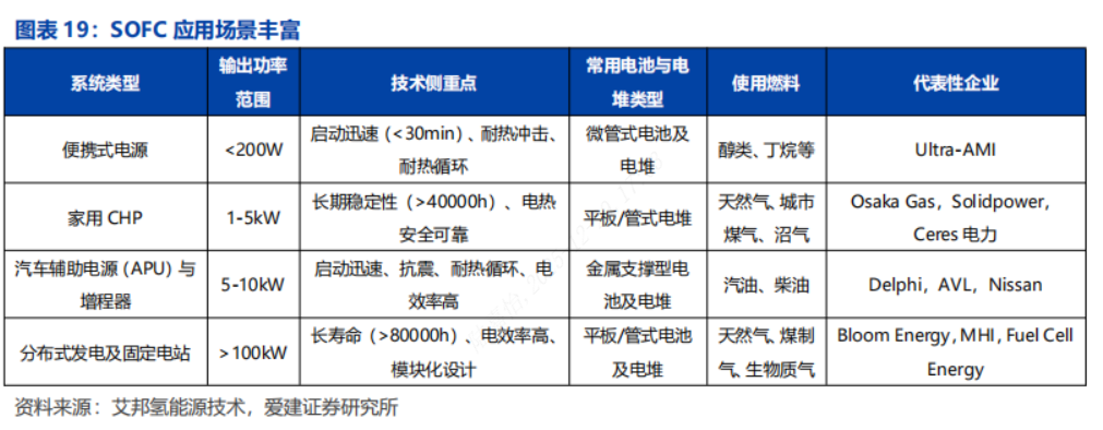 应用场景:适配多种应用场景。随着技术成熟与成本持续下降,SOFC产业化进程明显提速,全球多家龙头企业加速布局多元化应用场景。从便携式电源到大型分布式电站,SOFC凭借高效率、长寿命和燃料灵活性,逐步拓展交通、数据中心及能源基础设施等领域。当前,以Bloom Energy为代表的主要企业已实现规模化应用,推动SOFC在热电联供(CHP)、汽车辅助电源及固定发电站等场景落地,产业生态不断完善。