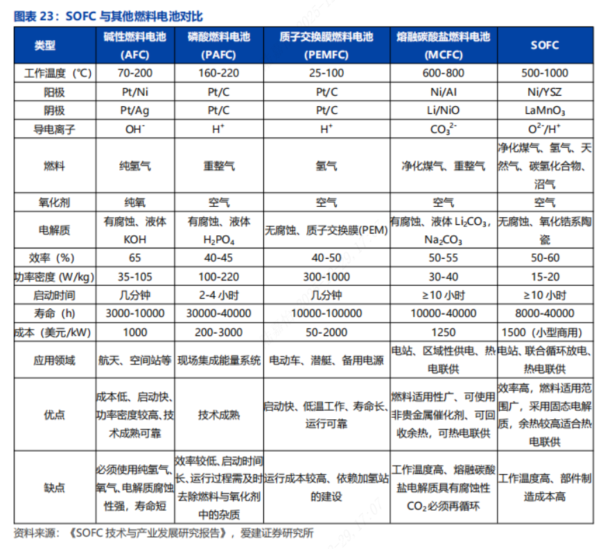 和燃气轮机相比效率较高,和其他燃料电池相比适配多种燃料。燃料电池简化了能量转换过程,与传统发电方式(如燃气轮机等)需要经过多步将化学能转化为电能不同,燃料电池可在单一步骤中直接完成这一能量转换,燃料电池不像燃气轮机旋转叶片那样具有较大的惯性,在从满载降至部分负载时不会出现效率下降的问题。燃料电池主要类型包括碱性燃料电池、磷酸燃料电池、质子交换膜燃料电池、熔融碳酸盐燃料电池和SOFC等。SOFC燃料电池适配燃料种类多样,固态电解质无腐蚀性,效率可达50-60%,余热质量高,若采用热电联产(CHP)方式,效率甚至可进一步提升至90%。