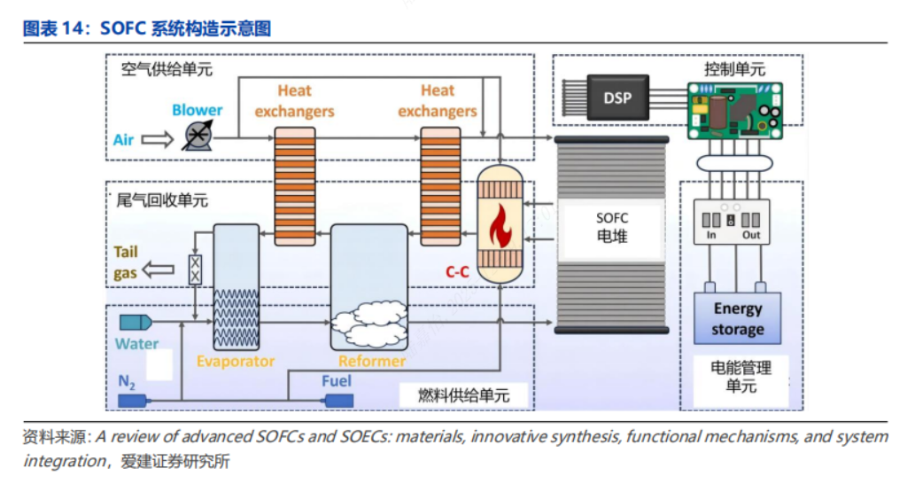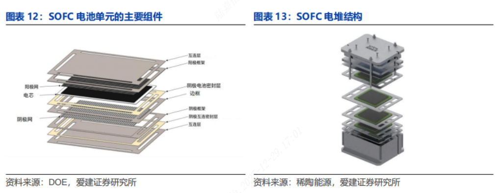 结构:电池单元-电堆-系统。电池单元:由阴极、电解质、阳极和连接体四部分组成;电堆:将化学能直接转化电能,是燃料电池核心。系统:由电堆和外围辅助单元构成,有空气供给预热单元、燃料供给(重整)单元、尾气回收单元、电管理单元以及控制单元等。