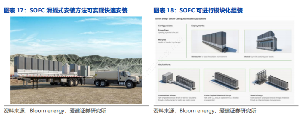 建设周期:模块化设计,安装便捷。SOFC具备模块化设计和快速部署能力,可灵活适配数据中心电力需求。其系统集成度高、响应迅速,支持即装即用,满足高可靠性与快速扩容要求,是应对数据中心动态负荷的理想选择。