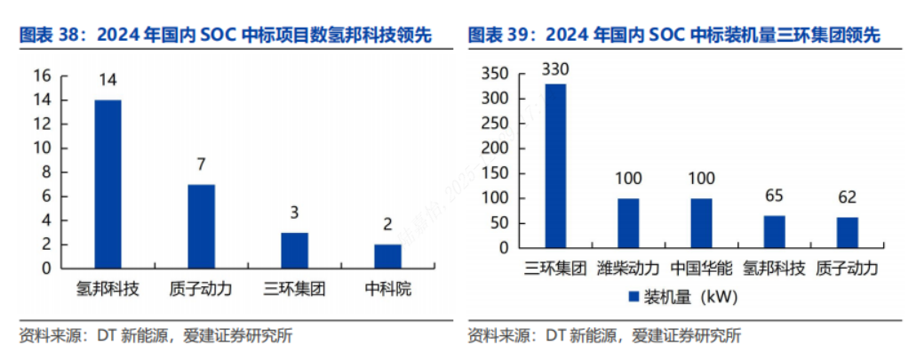 国内逐渐布局SOFC技术应用。SOFC、固体氧化物电解池(SOEC)和可逆固体氧化物电池(RSOC)统称为SOC,2024年国内SOC招标项目数为48个,主体设备的额定功率总计达近800kW,上述项目中SOFC占比近70%。从中标项目数量来看,氢邦科技以14项中标项目领先,质子动力以7个项目位于第二,三环集团以3个项目数位居第三;从公布的项目主体设备装机功率来看,三环集团以超过330kW的总功率领先,总装机功率超过百千瓦的企业还包括中国华能、潍柴动力等,氢邦科技、质子动力以较高的配套量位于前列。
