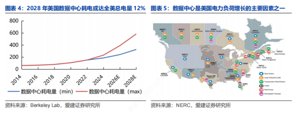 耗电:美国数据中心耗电量持续提升,成为电力负荷增长的主要因素之一。美国数据中心在2023年的耗电量约占美国总用电量的4.4%,预计到2028 年这一占比在6.7%-12%之间,数据中心的总耗电量已从2014年的58TWh增长至2023年的176TWh,预计到2028年,该数值将进一步迅速增长,处于325-580TWh之间。数据中心已成为美国电力负荷增长的主要因素之一。
