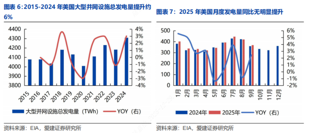 大型并网设施供电:美国大型并网设施总发电量提升较少,电力缺口问题逐渐加剧。2015-2024年美国大型并网设施总发电量仅提升约6%,2019-2020年甚至出现负增长,长期增长动能不足;2025年美国月度发电量与2024年同比无明显提升,短期供应格局无明显改善。据NERC,至2034年美国大部分地区电力产量将跌破备用容量边际,供电缺口问题将进一步凸显。