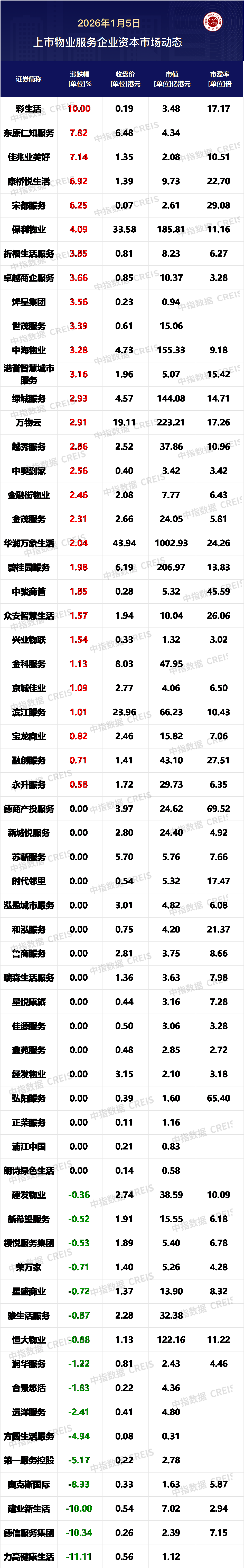 1月5日,恒生指数,收盘上涨8.77点,涨幅约为0.03%,报收26347.24点。今日61家港股上市物业服务企业中29家上涨。彩生活涨幅为10.00%,位列今日港股物业服务板块第一位。