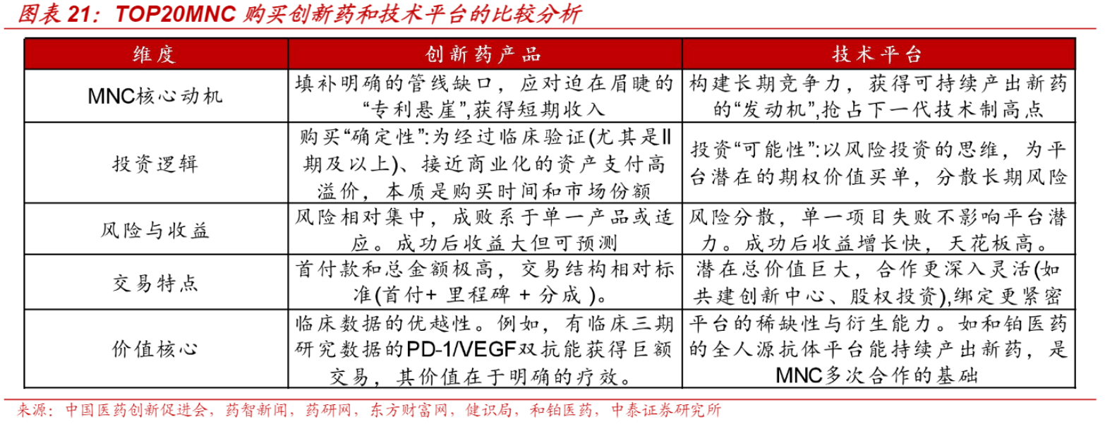 中泰证券通过医药魔方数据梳理了2025年TOP20 MNC从中国以及海外购买创新药以及技术平台的项目,通过分析发现TOP20 MNC在2025年从中国购买的创新药或者技术平台的平均总包为27.56亿美元,平均首付款为2.36亿美元,平均里程碑为29.78亿美元;TOP20 MNC在2025年从海外购买的创新药或者技术平台的平均总包12.89亿美元,平均首付款为1.53亿美元,平均里程碑为11.74亿美元。通过比较发现,MNC愿意为中国的创新支付更高对价。中国创新药的价值正被国际市场重新定价。