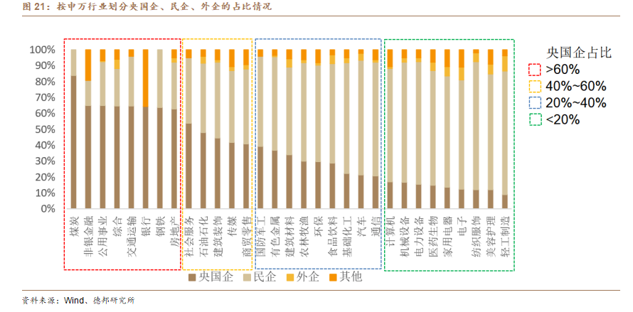 3)从内卷范围来看,上一轮主要聚焦传统重工业行业,本轮“反内卷”领域范围除了煤炭、有色金属、化工等行业外,外沿或将扩展至光伏、锂电、汽车等新兴制造业;从行业属性来看,煤炭、大金融、公用事业、交运、钢铁、地产等板块央国企占比较高(超60%),通过行政手段实现供给侧出清的概率较大,纺织服饰、轻工制造、电力设备、机械设备、美容护理、医药生物、汽车等板块民企占比较高,通过市场化出清的概率较大。