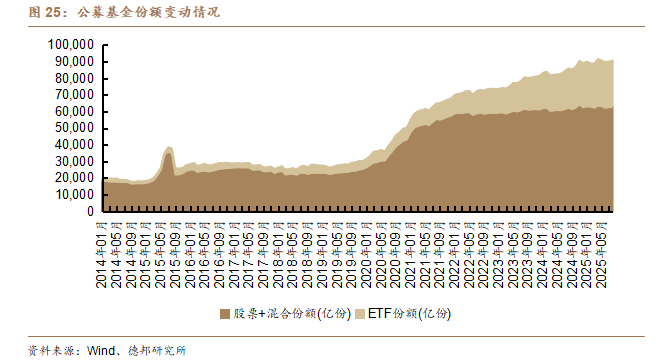 此外,Wind数据显示,2024年8月至2025年8月,公募基金主动管理产品(股票+混合产品)的份额增加了700亿份,但同期被动管理产品ETF的份额增加了4039亿份,资金向透明化、工具化产品迁移已成趋势性特征。