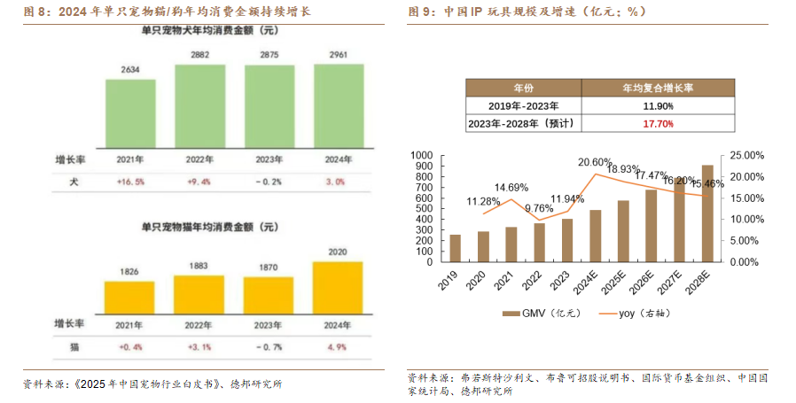 情感共鸣&社交陪伴——宠物/潮玩:随着单身经济和银发经济的发展,消费者对情感陪伴和社交的需求在持续增长,其中宠物陪伴和潮玩产品成为新的消费需求。①宠物经济:根据派读宠物白皮书,2024年我国宠物市场规模达3002亿元,同比+7.5%,2021-2024年CAGR为+6.4%,处于快速提升阶段,预计2027年市场规模有望超4000亿元,养宠的情况价值日益凸显。②潮玩IP:以泡泡玛特为代表的IP衍生潮玩品牌正在快速出圈,相较于游戏、观影等其他IP形式,潮玩这类轻量级IP产品具备较低的单次消费门槛和随机抽卡等社交玩法能快速获得情绪反馈,正在成为新的情绪价值类消费产品。