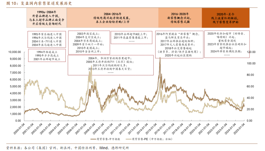 复盘国内渠道变革历程:经历了传统大卖场时代-传统电商时代-新零售时代,一路发展至今。第一阶段(1990s-2004年):外资品牌进入中国市场,本土超市正面竞争,开启大卖场时代,市场参与者跑马圈地;第二阶段(2004-2016年):传统电商(淘宝、京东、美团)兴起并快速发展,传统零售龙头发展成熟并相继上市(永辉、高鑫零售),行业内兴起收并购浪潮;第三阶段(2016-2020年):阿里2016年提出新零售概念,市场相继出现盒马鲜生、无人零售、社交零售、社区团购等新零售模式,传统零售式微;第四阶段(2020年-至今):市场涌现一批主打性价比的软折扣超市(好特卖、嗨特购),以及社区硬折扣超市(家家悦好惠星、奥乐齐等),24年开启胖东来调改浪潮。渠道端从单一的大卖场模式,逐步发展为多元化、分散化的线上线下全渠道模式。