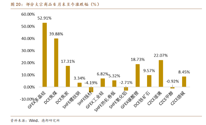 “反内卷”相关政策迅速出台之后,对市场情绪的提振程度更加显著。大宗商品价格多数上涨,众多品种价格得到明显修复。其中多晶硅价格涨幅最大,6月末至今涨幅达52.91%;焦煤、焦炭、碳酸锂和玻璃等大宗商品也有较大涨幅。由于政策出台时间较短,实效有限,所以短期内大宗商品价格行情的修复主要依赖市场情绪提振,而展望未来,我们认为大多数大宗商品仍将回归基本面定价。因此,供给端限制不足且需求持续走弱的商品价格回升仍有难度,而供给有一定限制或需求维持增长的品种价格预计能够受益相关政策刺激维持价格韧性。