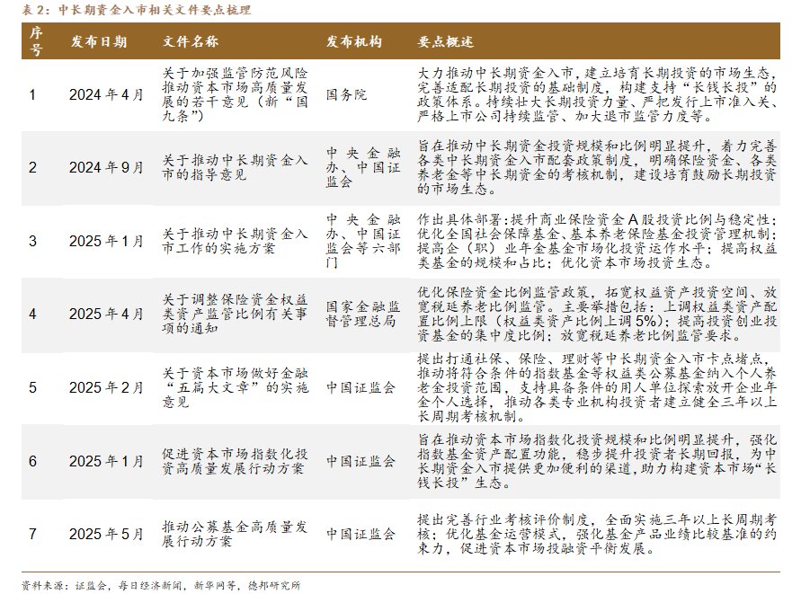 积极拓宽中长期资金入市渠道。924以来,政策层围绕“中长期资金入市”出台多项核心文件,形成“顶层设计+配套细则+激励措施”的完整制度链。