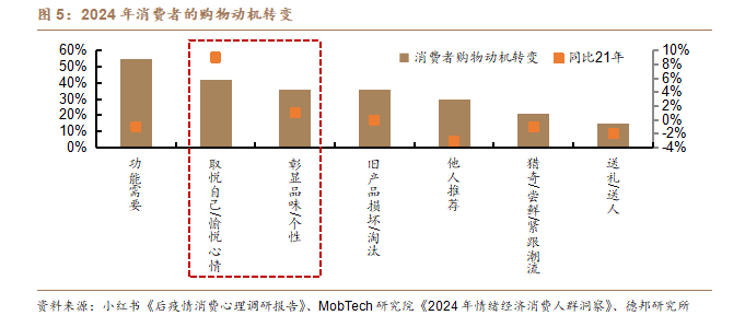 传统消费以“白酒”为代表,在人口和经济的高增速时代,以价增和量涨为行业扩容的核心支撑,主要以满足家庭生活和社交活动的基础需求为主;而新消费则将重心从“物质消费”走向“精神消费”,不局限于某一个具体行业,更加注重情绪价值。根据小红书调研报告,2024年消费者功能需要仍占首位,但情绪价值需求更加突出,“取悦自己”、“彰显个性”的消费动机提升最快,占比较2021年分别提升9%、1%。