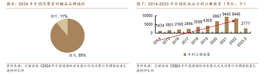 国潮复兴&文化认同——黄金珠宝/美妆/影视:中国经济实力增长推动国潮自信和本土文化觉醒,大众消费者对国货品牌产品接受度在逐步提升。①黄金珠宝:传统工艺制作的国风饰品越来越受欢迎,以老铺黄金、周大福“传承“系列、潮宏基“非遗花丝”系列为代表的珠宝品牌更多强调东方文化传承。②美妆:本土美妆品牌崛起,从包装、品类、功效再到生产工艺、原料越发注重自主创新,14-21年化妆品专利数量逐年增长。③影视:近年来国潮动画热度居高不下,《长安三万里》、《姜子牙》、《哪吒系列》等佳作不仅是中国IP的成功商业化典范,亦是潮流的年轻化表达。