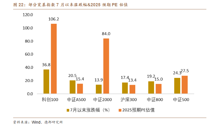 价格端的企稳回升不仅是短期市场波动的结果,更是市场对于供需关系改善与产业结构优化的预期集中体现。随着无序扩张的产能逐步出清,行业集中度提升,价格下行压力得到缓解,市场信号开始由“恶性竞争”转向“价值回归”。这一变化在企业层面表现为利润率和现金流的修复,在宏观层面则强化了对经济韧性和增长前景的信心。当盈利预期稳步改善,资本市场的风险溢价自然趋于收窄,投资者风险偏好得到提振,进而推动估值体系逐步修复。这一传导链条表明,价格修复不仅是行业层面的良性循环,更是资本市场回暖的重要前提和宏观经济转型中的关键环节。以宽基指数的涨跌情况和估值变化为例,7月以来科创100指数涨幅最高达36.8%,同时PE估值也达到了106.2倍,显示出股票市场对于科技类高估值板块的偏好。