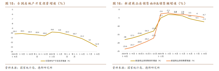 与亮眼的总量数据形成鲜明对比的,是房地产领域的持续承压。1—8月份,全国房地产开发投资6.03万亿元,同比下降12.9%,其中,住宅投资4.64万亿元,下降11.9%;1—8月份,新建商品房销售面积5.73亿平方米,同比下降4.7%;其中住宅销售面积下降4.7%。新建商品房销售额5.50万亿元,下降7.3%;其中住宅销售额下降7.0%。当前我国房地产行业正处于深度调整阶段,投资与销售持续下行,行业整体仍在去库存与风险化解的过程中。