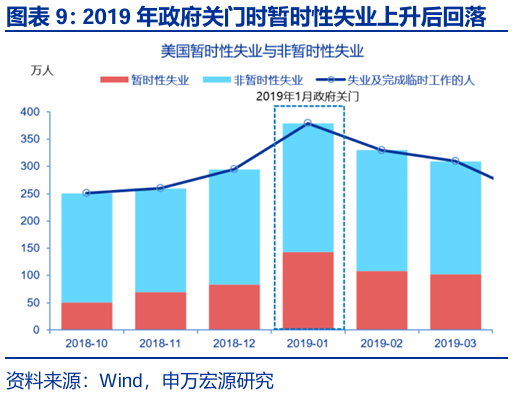政府关门可能小幅临时抬升失业率,政府复工后出现回落,政府关门一个月,可能导致失业率小幅抬升0.1个点。失业率数据来自住户调查(CPS),CPS向约6万个家庭进行调查,直接询问个人的就业状况。在调查周(每月包含12日的当周)没有工作,且预计会被召回的联邦雇员,被统计为临时失业。政府关门期间,失业率统计口径上的临时失业可能增加,但通常在复工后一月内回落。2018年底至2019年初34天的政府关门中,失业率在2019年1月小幅上升0.1个百分点至4.0%,BLS指出政府关门对失业率上升有贡献,当月临时性失业人数上升17.5万至93.7万。2月复工后,失业率回落0.2个百分点至3.8%,失业人数下降30万至620万,其中临时性失业人数减少22.5万。2013年10月的政府关门中,CPS临时失业人数增加44.8万人,次月复工时下降了37.7万人,属于临时失业上升后回落的典型案例。