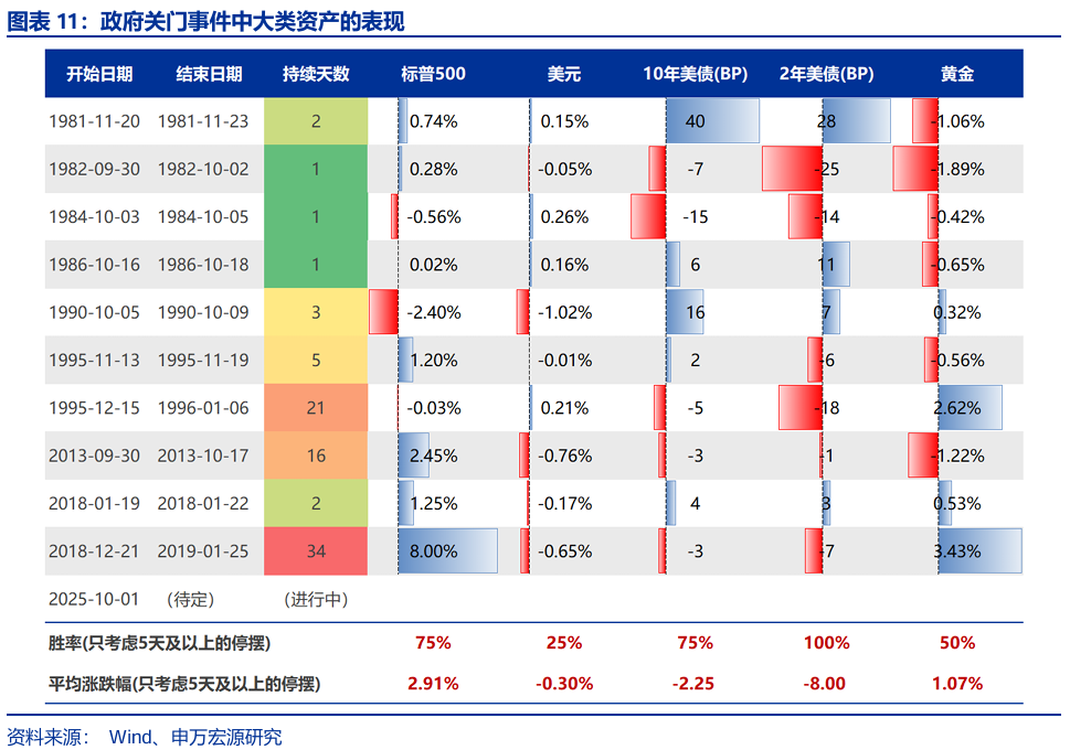 政府停摆对大类资产的长期影响相对有限。美股并不必然恐慌下跌,标普500在政府关门期间平均涨幅2.91%,胜率75%;美债出现温和避险交易,前端下行更明显,10年期美债胜率75%,平均下跌2.25BP,2年期美债胜率 100%,平均下跌8BP;美元偏弱但跌度不大,平均下跌0.30%;黄金小幅上涨但胜率不高, 平均上涨1.07%,长期政府关门事件中,黄金涨幅更高。