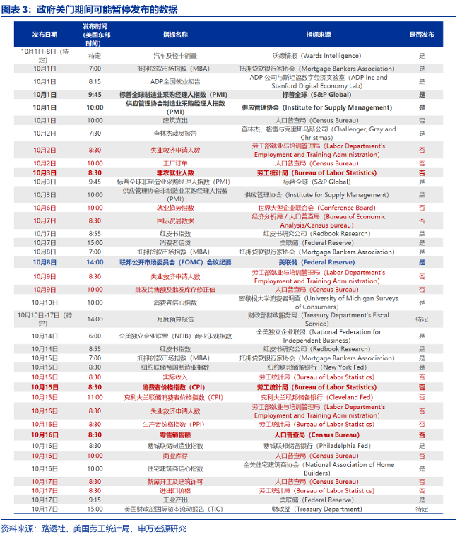 政府“关门”期间,非必要政府活动停止运作,涉及生命财产、国家安全的必要活动依然可正常运转。联邦统计与数据可能暂停发布,主要受影响的有美国人口普查局的零售、地产等数据;美国劳工统计局的非农就业、失业率、CPI等数据;军事、执法、社保、医保等职能继续运作。