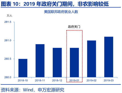 政府关门对非农就业往往无实质影响。非农就业数据来自企业调查(Current Employment Statistics,CES),美国劳工部每月向12万家企业和政府机构进行调查,若一名员工在每月包含12日的发薪期内获得了薪酬(包括依法将补发的薪酬),就会被统计为就业。2019年通过的《政府雇员公平待遇法案》要求政府关门结束后联邦雇员自动补发停摆期工资,因而非农就业通常不受影响。2019年历史最长的政府停摆发生时,美国劳动部在2019年1月就业报告的中指出,政府关门对就业、工时、薪资“无可辨识的影响”。