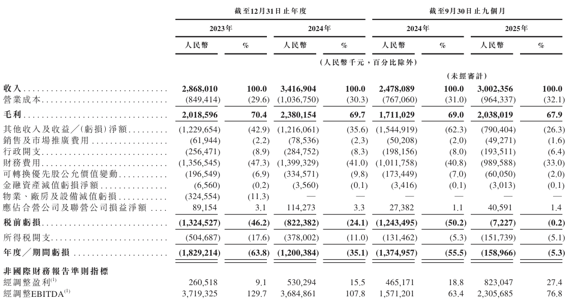 公司于2023年及2024年分别录得亏损18.29亿元、12亿元;2025年首9月,亏损同比大幅收窄88.44%至1.59亿元。